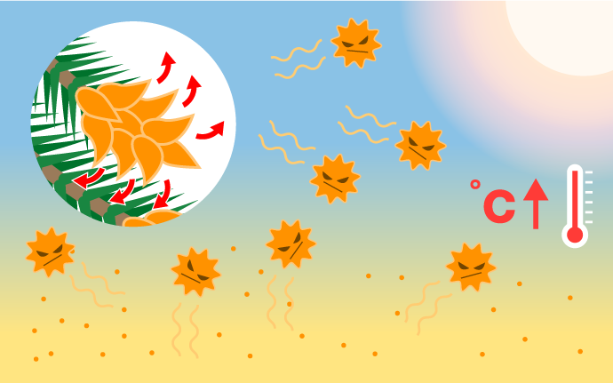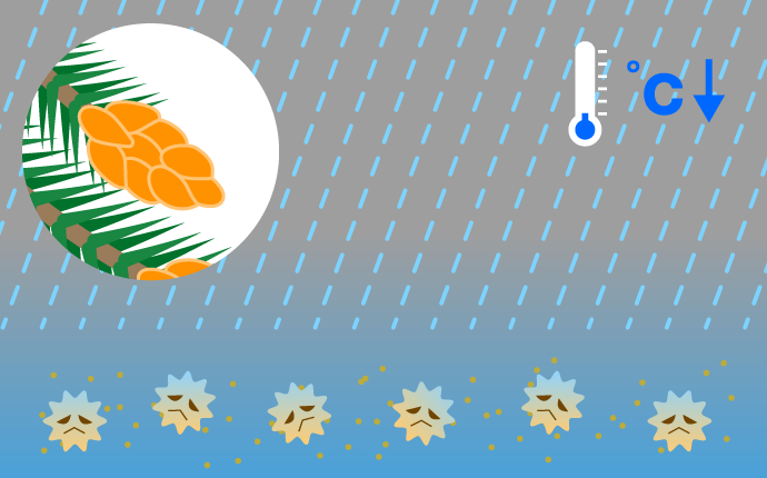 ②雨の日は湿度が高く、濡れた花粉が地面に落下。水分の重みにより空気中を漂いにくい。